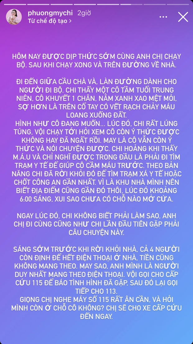 bất thần đăng loạt story trên Instagram cá nhân chủ nghĩa để kể về việc bắt gặp 1 người đàn bà đang chảy máu nhiều, xanh xao và mỏi mệt do rạch tay ngay trên cầu. Theo lời nữ ca sĩ nhí chia sẻ, tuồng như người đàn bà luống tuổi kia đang có ý định bị động nên cô và người thân chóng vánh tiếp cận để trợ giúp.